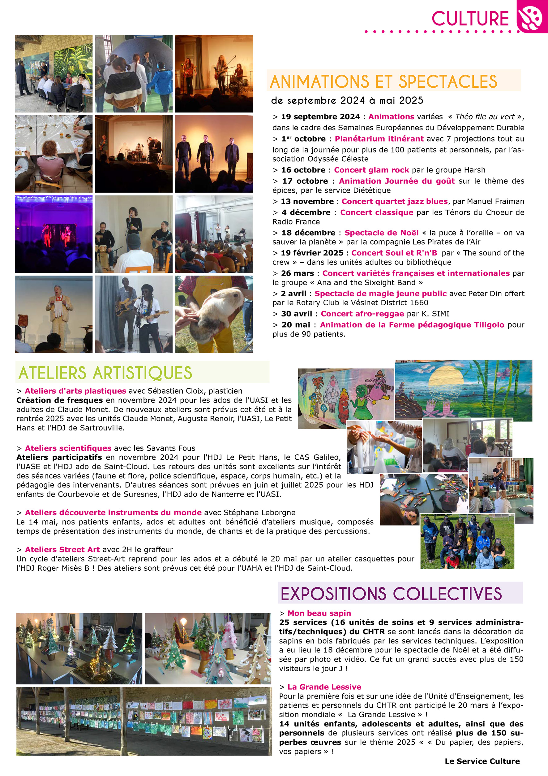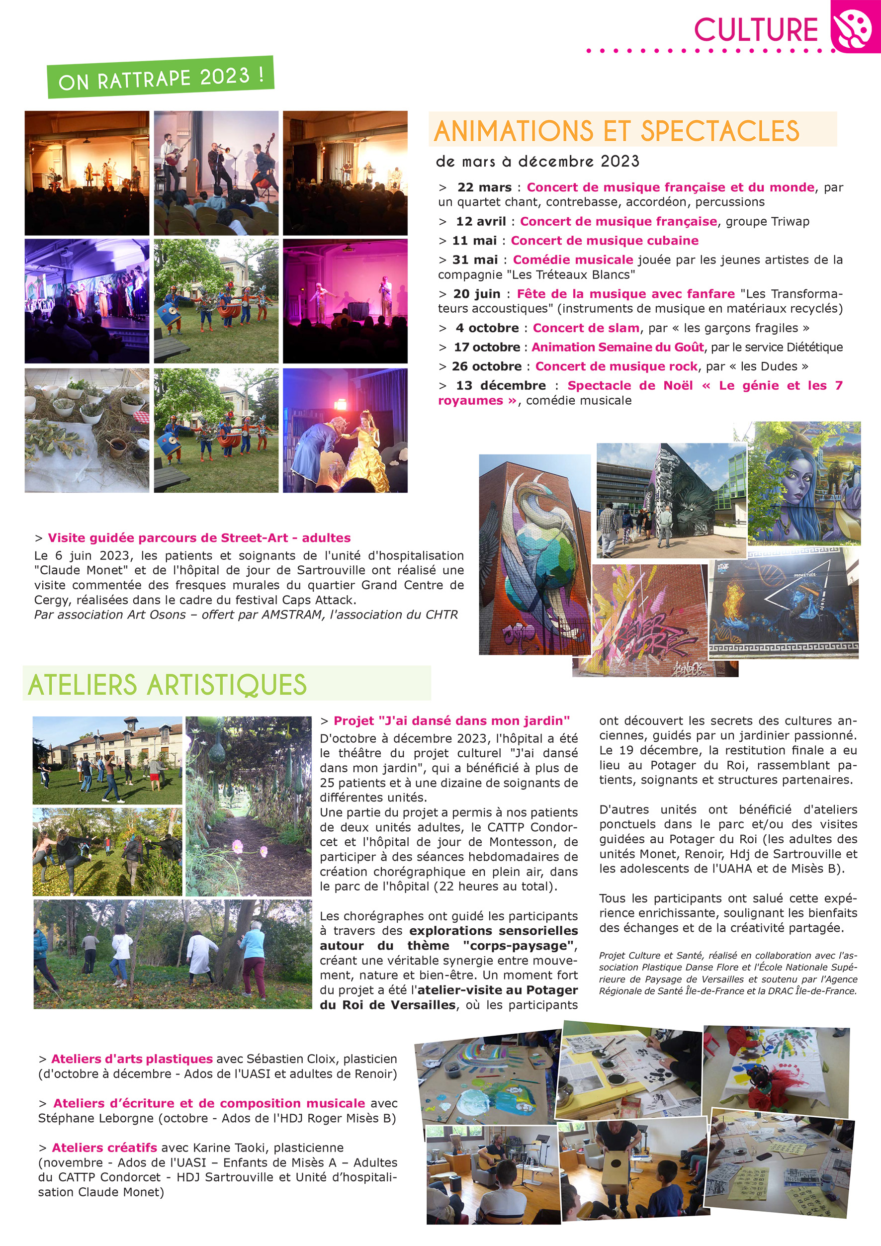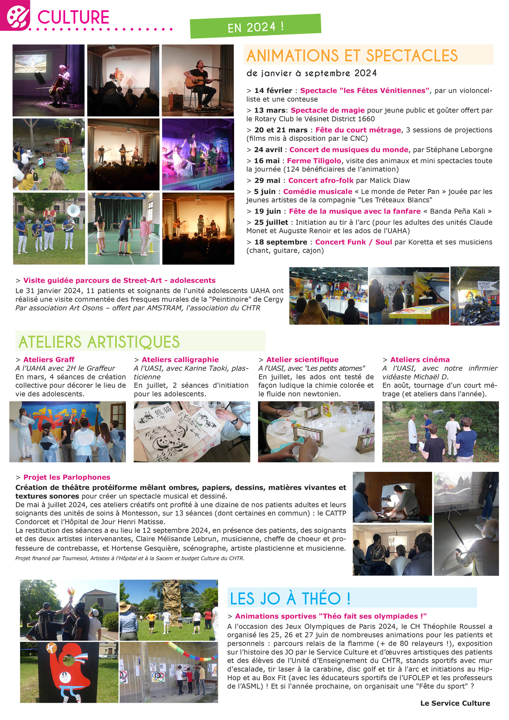 Le Centre Hospitalier Théophile Roussel propose de nombreux événements et ateliers (uniques ou sur plusieurs séances) aux patients hospitalisés :