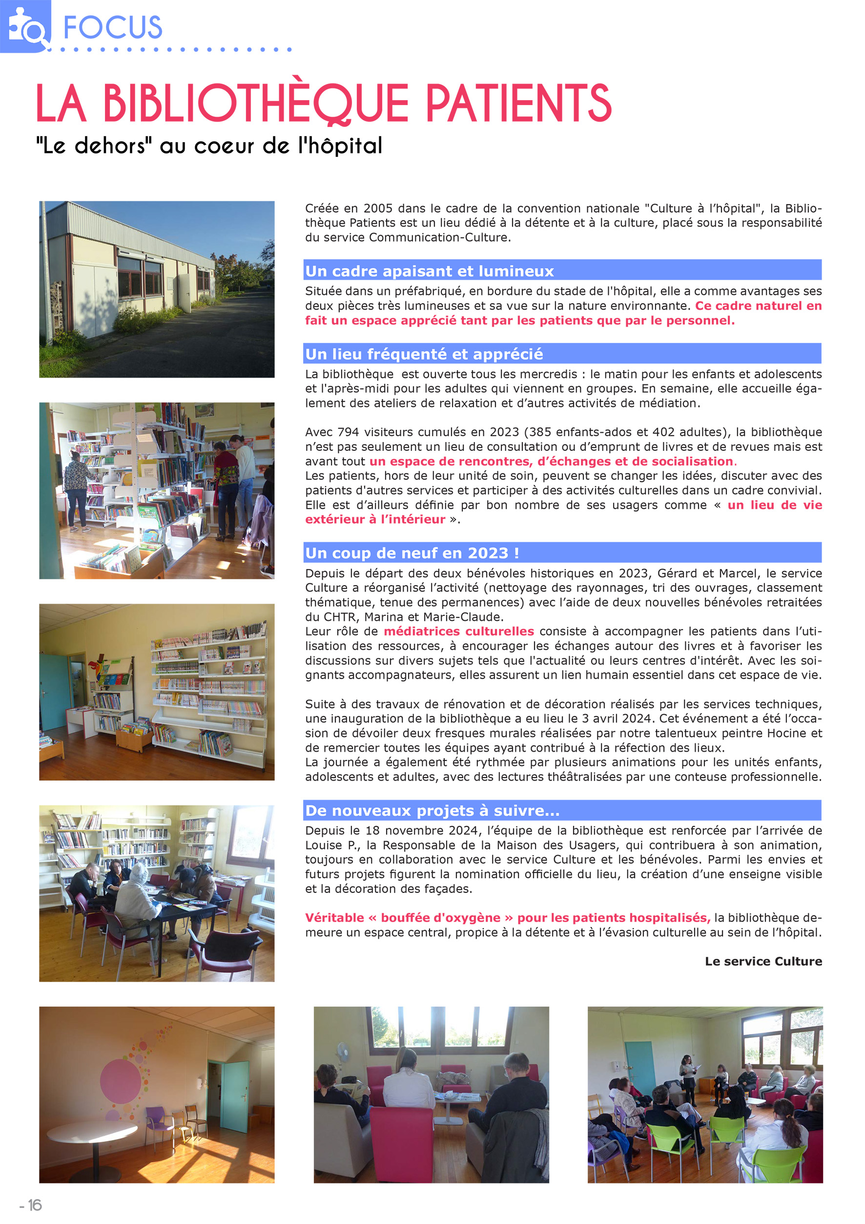La culture joue un rôle essentiel dans cette évolution. En dehors de tout objectif thérapeutique, elle participe à l’amélioration de l’environnement des personnes et contribue à favoriser la relation de l’hôpital avec l’extérieur. Un séjour à l’hôpital peut ainsi être l’occasion d’un contact privilégié avec la culture, la découverte de la création artistique, du patrimoine ou de la littérature. Un moment à part, qui peut se révéler enrichissant.